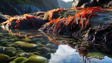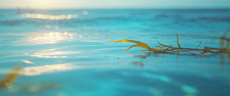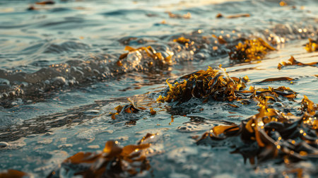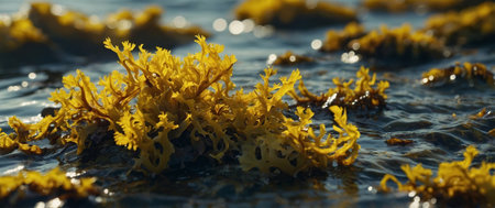 AI Generated. Closeup of yellow seaweed in the water on the ocean shore