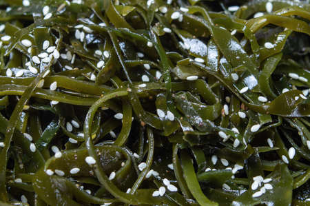 Seaweed salad. Asian cuisine. Seaweed (kelp) sprinkled with sesame seeds, close-up, soft focus. Laminari