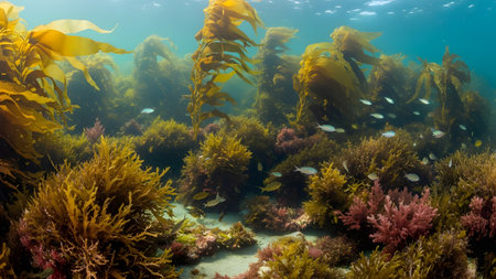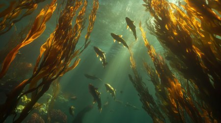 close-up of kelp forest with schools of fish swimming among the strands, created with generative ai