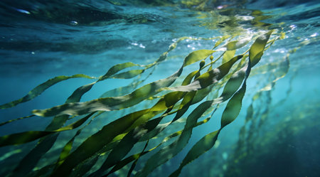 Lush green seaweed sways gently beneath the surface of tranquil turquoise water, showcasing the stunning ecosystem of a coastal environment on a sunny day.