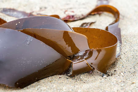A close up image of large blades of sea weed washed up on the shore in the Pacific Ocean.