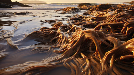 AI Generated. Closeup of yellow seaweed in the water on the ocean shore