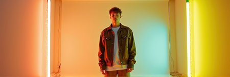Young caucasian male in stylish urban outfit amidst colorful neon lighting.