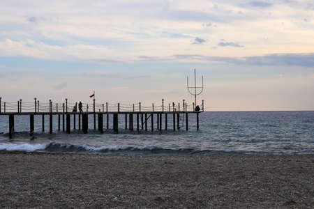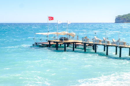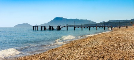 Mediterranean landscape in Antalya, Turkey. Blue sea, pier and far mountains.