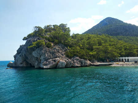 View of the stone beach at the site of the ancient Lycian city of Phaselis. Historic site. Place for recreation of the local population.