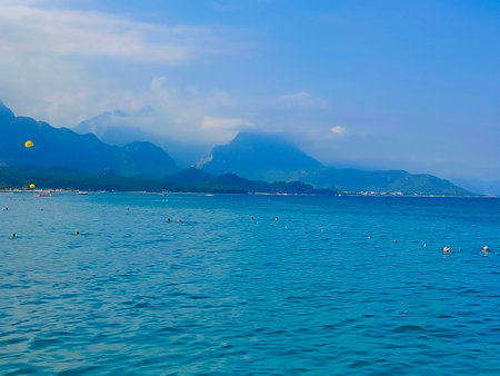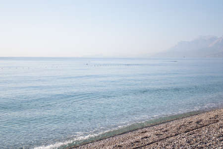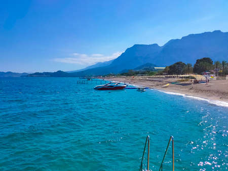 Konyaalti beach in Antalya, Turkey. Long Turkish beach on the Mediterranean sea in warm sunny summer weather. Rest of tourists at the seaside resort