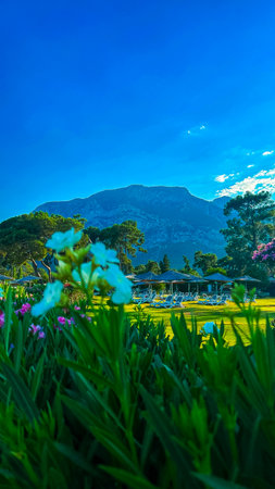 Beldibi, Kemer, Antalya, Turkey - May 11, 2021: The view of Rixos Beldibi hotel 5 stars at Beldibi, Kemer, Antalya, Turkey on May 11, 2021