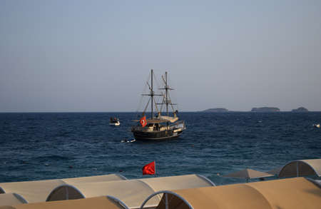 Large sailing ship in the Mediterranean sea in a pirate style in the open sea against a blue sky. The concept of summer holidays. Pirate cruise sail ship, Tekirova, Turkey. 26 september, 2020