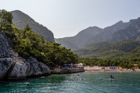 Goynuk, Antalya, Turkey - May 11, 2021: Beach on the Mediterranean coast in town Goynuk near Kemer, Antalia riviera, Turkey.