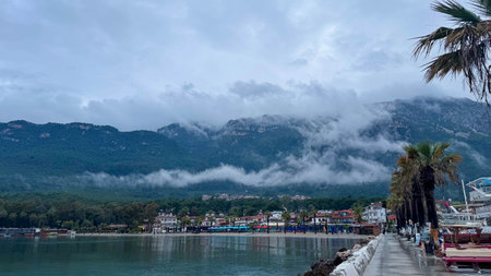 Scenic view of Akyaka, Turkey, with misty mountains, palm trees, and waterfront promenade. Atmospheric cloudy landscape with seaside town, nature, and coastal beauty.