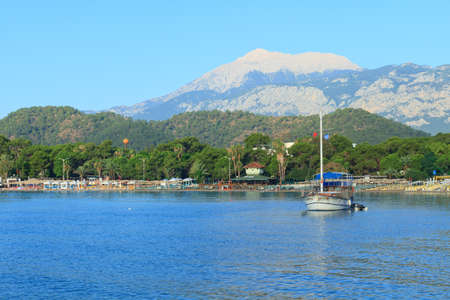 Splendid Mediterranean seascape in Turkey. Sunny view of a small azure bay near the Tekirova village vith Mt. Tahtali on background. Beauty of nature concept background.
