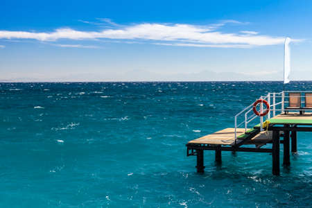 Storm on the Mediterranean Sea. Red lifebuoy on the pier. Mountains and sky in the background. The concept of a safe holiday at sea.