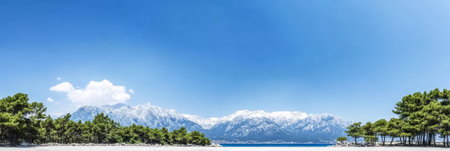 A scenic beach with clear blue water, mountains in the background, and a bright sky. Coastal landscape on a sunny day, relaxation and nature concept
