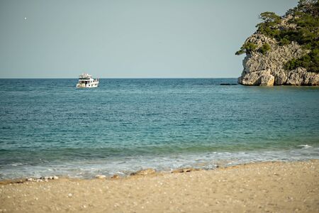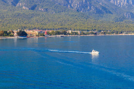 White luxury yacht sailing in the Mediterranean sea in Kemer, Antalya province, Turkey. Turkish riviera
