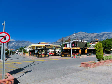 Kemer, Antalya, Turkey - May 11, 2021: The road and street at Kemer, Antalya, Turkey with shops, palms and hotels