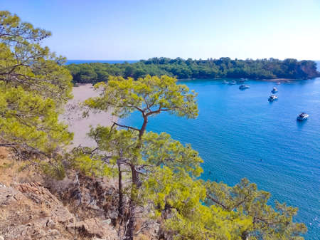 Pine tree on the background of the turquoise sea in Kemer, Turkey