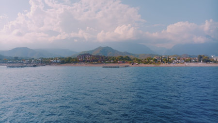 CHIRALI, TURKEY: aerial view Sunny beach resort in Turkey with stunning views of the mountains
