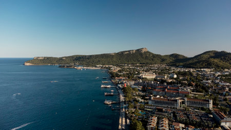 Aerial view of coastal area of Kemer, Turkish beach resort city. Beautiful Mediterranean Sea. Turquoise colors of water. Drone shot
