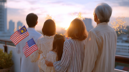 A heartwarming scene captures a family standing together on a balcony during sunset, holding flags and sparklers, symbolizing unity and celebration.
