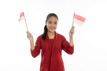 Indonesian woman grab red and white flag. Wearing kebaya