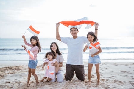 excited indonesian family supporter with indonesian flag in the beach together