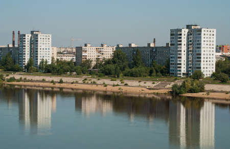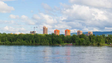 Summer landscape of Krasnoyarsk city. Modern apartment buildings by the Yenisey river