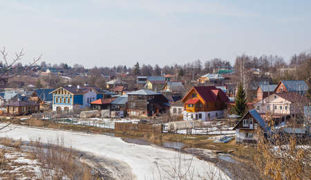 A curved, frozen river stretching into the distance, wooden houses on the shore. Spring, snow melts, puddles and dry grass all around. Day, cloudy weather, soft warm light.