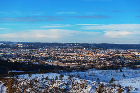 Winter view of the city of Brno in the Czech Republic in Europe. Houses and chimneys are visible. Palava can be seen in the background. There are dramatic clouds in the sky. Photo from Hady quarry.