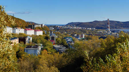 Autumn panorama view of Kamchatka city landscape, old Soviet residential building of Petropavlovsk-Kamchatsky City on sunny clear day with blue sky. Eurasia, Russian Far East, Kamchatka Peninsula.
