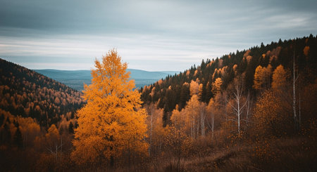 A vibrant autumn landscape featuring a solitary orange tree amidst rolling hills covered in golden and green foliage under a cloudy sky