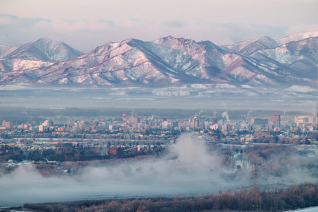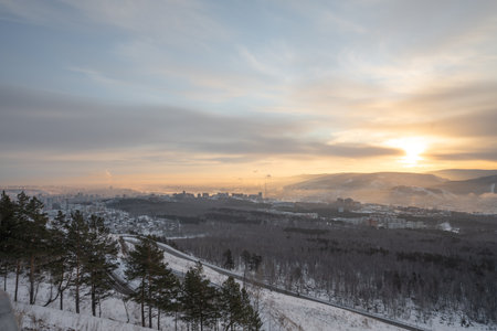 winter nature nature city smoke from the pipes of the plant ecology sunset red sun evening