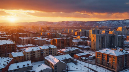 Yekaterinburg aerial panoramic view at Winter in beautiful cloudy sunset. Ekaterinburg is the fourth largest city in Russia located in the Eurasian continent on the border of Europe and Asia. Yekaterinburg, Russia