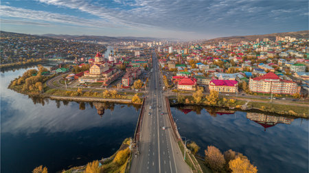 Captivating aerial view of a vibrant cityscape beside a serene river, showcasing colorful buildings, a busy road, and stunning reflections against a clear blue sky.