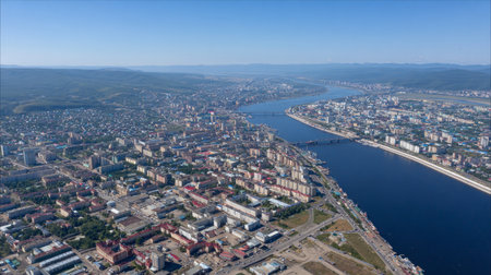 View of the city of Khabarovsk from the Spaso-Preobrazhensky Cathedral. Urban landscape.