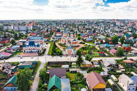 BERDSK, Novosibirsk Region, Western Siberia of Russia - June 6, 2021: Transfiguration Cathedral of the Novosibirsk and Berdsk Diocese among urban buildings, from a bird's-eye view
