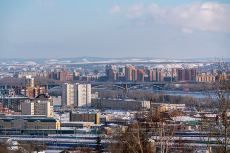 Krasnoyarsk city aerial panoramic view from Karaulnaya Mountain viewpoint in Krasnoyarsk, Russia