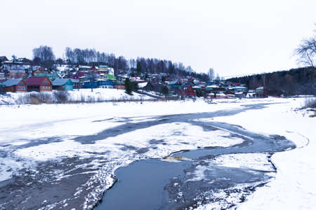 Frozen river, thawed places and beautiful landscape