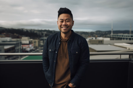 Portrait of a handsome asian man smiling at the camera while standing on the rooftop of a building