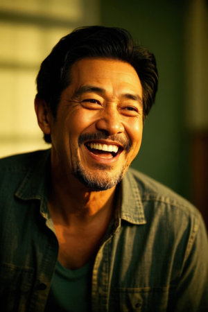 The confident smile of a mature man, the charming demeanor of an Asian man