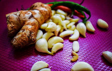 Stock photo of peeled garlic, few green chillies and ginger kept on purple color chopping board. Picture captured under natural light at Bangalore, Karnataka, India. focus on object.