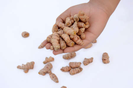 bunch the brown yellow turmeric hold on hand isolated on white background.