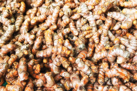 Turmeric roots closeup. Fresh harvest of many turmeric roots background texture.