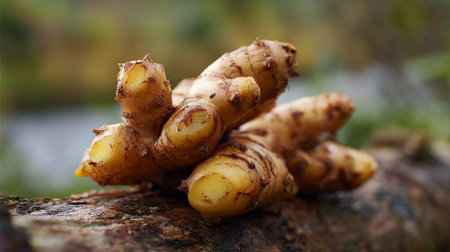 Fresh Ginger Root Close-Up Against Greenery Background, Promoting Natural Wellness