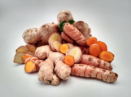 Fresh turmeric on white background,raw material for cooking. Close up.