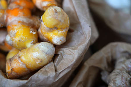 raw turmeric vegetables at vegetable store for sale at evening