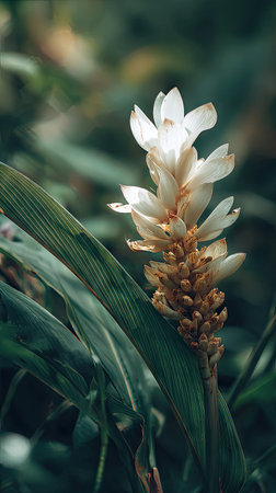 A detailed photograph of a single Galangal, swaying gently in the wind, captured in natural daylight. Fresh and airy atmosphere, soft motion blur on leaves, crisp details on textures, background softly blurred into natural greenery, cinematic natural light, realistic photography.