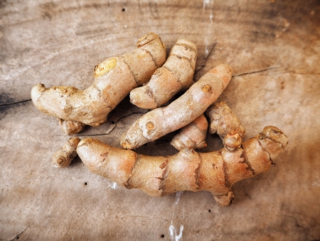 Close up yellow turmeric herb on wood table.