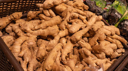 ginger root, on the shelves of a hypermarket, selling vegetables. Soft focus. Close-up