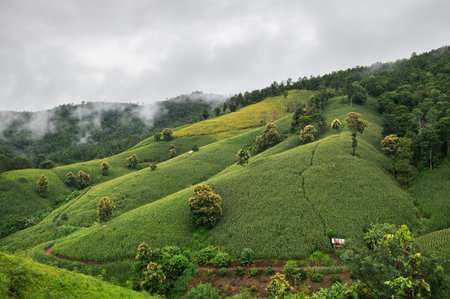 Agriculture fields of corn on the hills in green season of Mae Chaem District, Chiang Mai Province, beautiful landscape in Northern Thailand