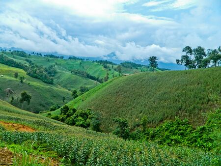 Corn field on the mountain with Blue sky and cloud in Phrae Thailand, Summer landscape with green field.